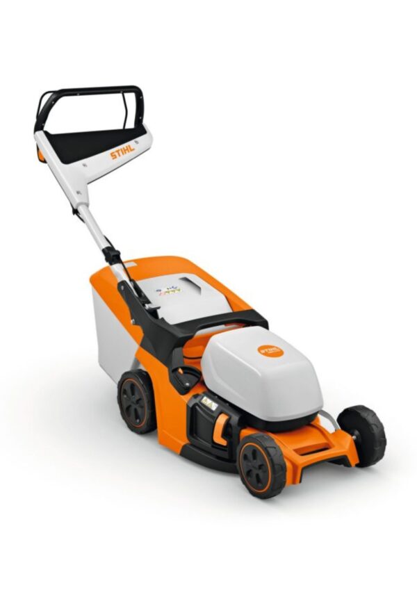 Funkcja 4 w 1, wyrzut boczny, przysłona na do mulczowania i nóż wielofunkcyjny. Obudowa z tworzywa sztucznego z listwami ochronnymi, centralna regulacja wysokości koszenia, komfortowy pojedynczy uchwyt kierujący, składany, z 2-stopniową regulacją wysokości. Dłuższy czas pracy dzięki zoptymalizowanej geometrii noża i automatycznej regulacji prędkości obrotowej. W komplecie 52-litrowy składany kosz na trawę ze