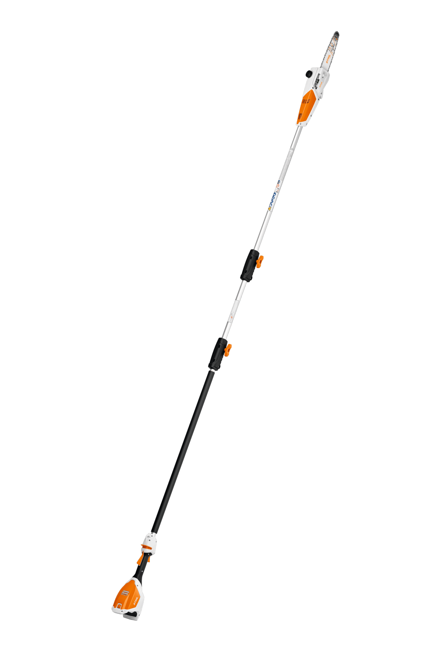 Piła łańcuchowa PM3 1/4” i boczny napinacz piły łańcuchowej. Hak do gałęzi do łatwego usuwania ściętego materiału z drzewa, półprzezroczysty zbiornik oleju, ergonomiczna jednostka sterująca i dzielony wysięgnik umożliwiający łatwy transport i wygodne przechowywanie urządzenia. Długość całkowita 280 cm.
