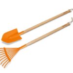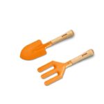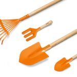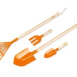 Zestaw ogrodowy dla dzieci zawiera: grabie, dużą łopatę oraz grabki i małą łopatkę. Idealny zestaw do zaangażowania dzieci do zabawy w ogrodzie wraz z rodzicami. Wszystkie narzędzia zastały wykonane z lakierowanego