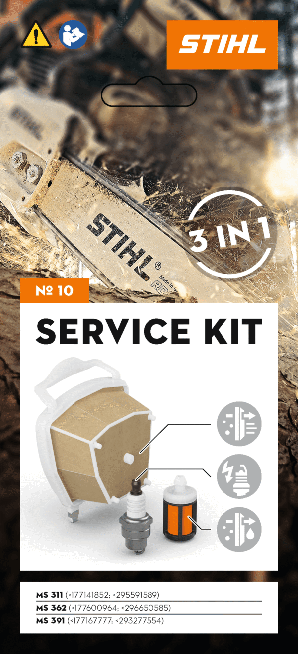 Zestaw serwisowy do pilarek spalinowych STIHL pozwala na samodzielne, proste prace konserwacyjne. W zestawie świeca zapłonowa, filtr paliwa oraz filtr powietrza HD2 lub z włókniny ( w zależności od modelu urządzenia). Regularna konserwacja gwarantuje dłuższą żywotność urządzenia. Do wymiany nie potrzeba żadnego dodatkowego narzędzia oprócz klucza uniwersalnego dołączonego do każdej pilarki STIHL.