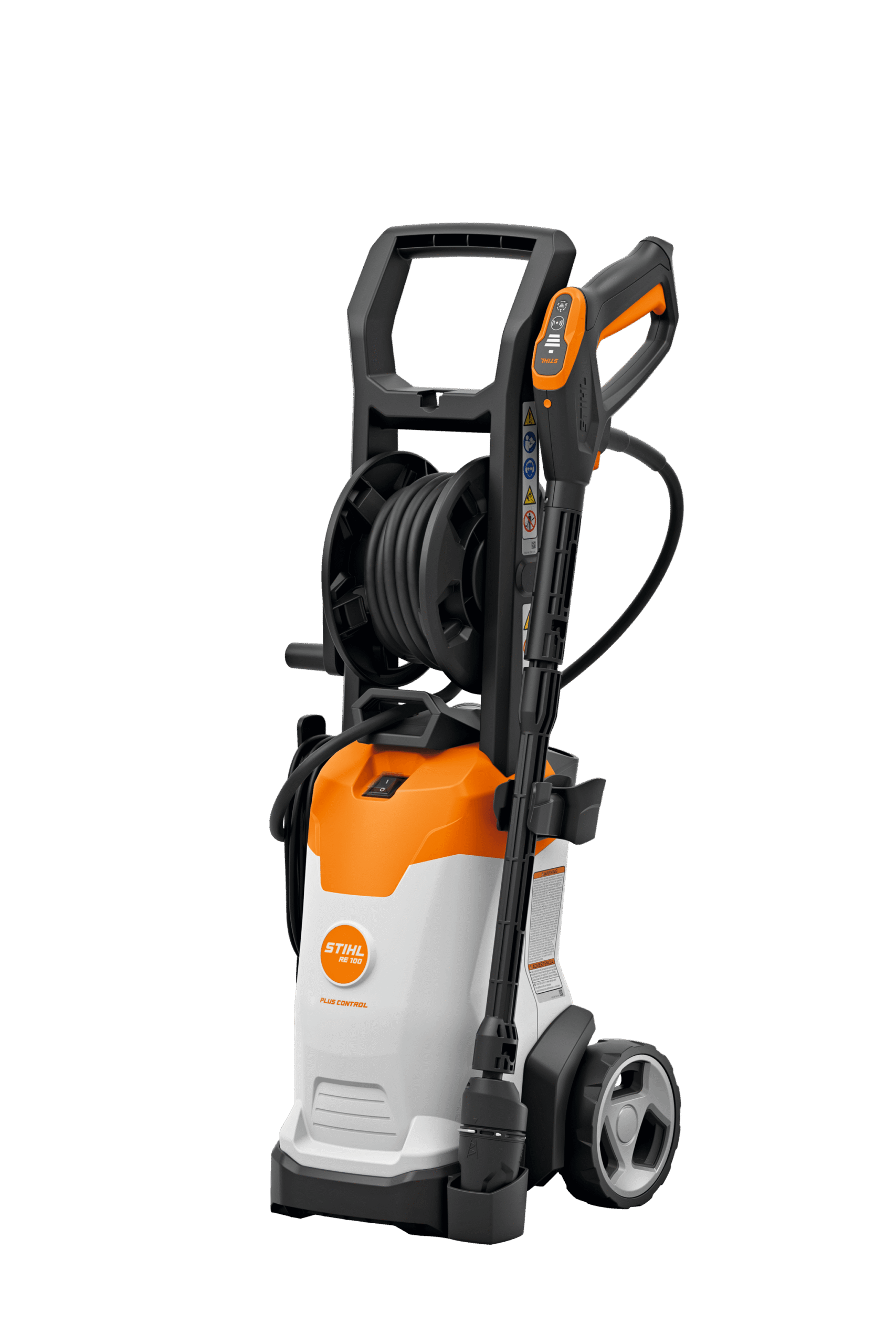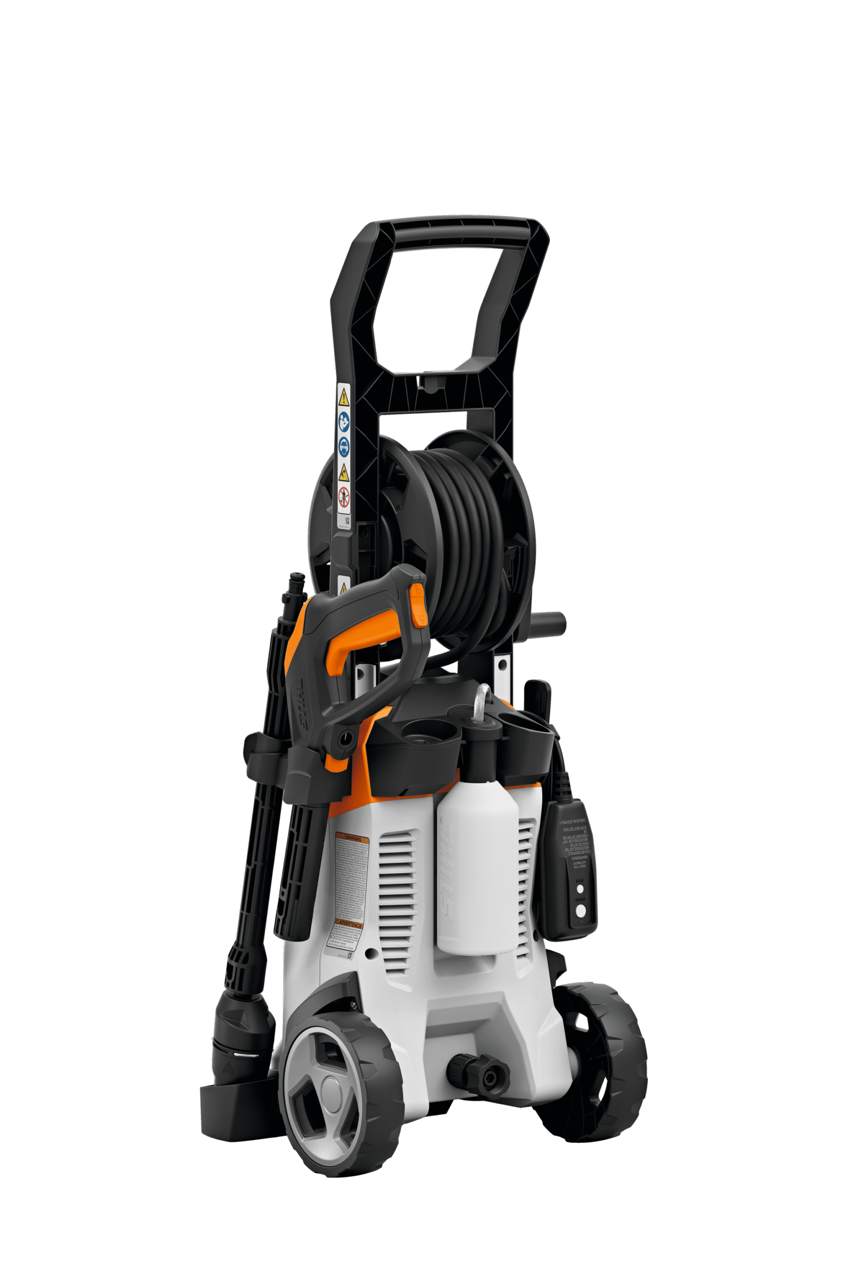 Funkcja CONTROL z regulacją ciśnienia za pomocą przycisku oraz wskaźnikiem ciśnienia LED bezpośrednio w pistolecie. Bęben na 7-metrowy wąż ułatwiający obsługę i przechowywanie. Dysza 3-w-1 ze zintegrowaną dyszą rotacyjną, dyszą płaską i dyszą do rozpylania środka czyszczącego. Ergonomiczne i bezpieczne przechowywanie akcesoriów bezpośrednio na myjce.