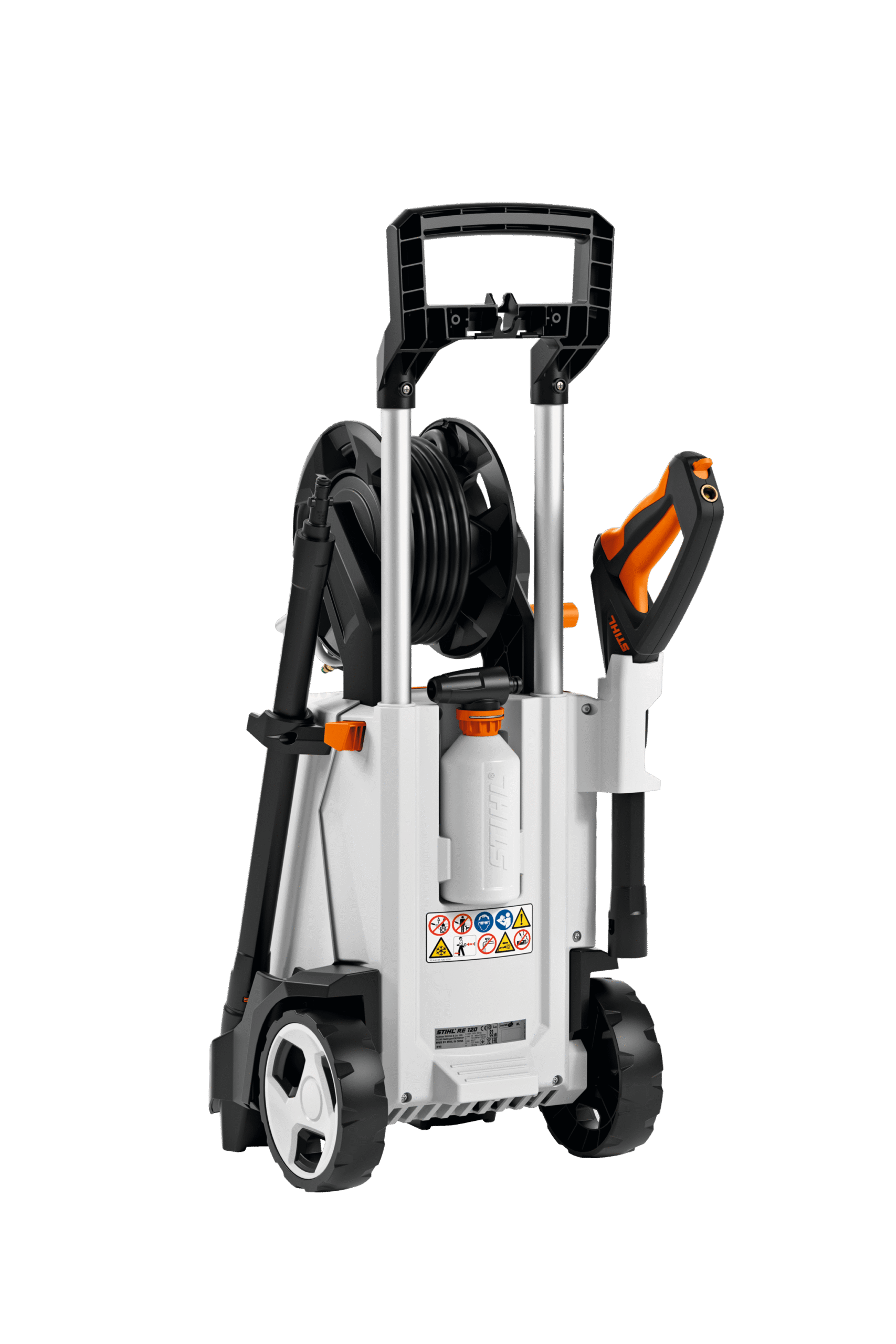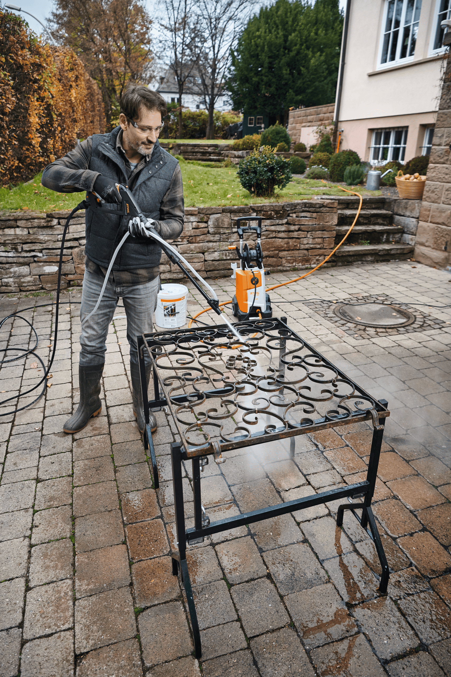 Bezszczotkowy silnik indukcyjny, wysokiej jakości pompa z aluminium oraz wąż ciśnieniowy w oplocie stalowym. Kompaktowa konstrukcja z wysuwanym, aluminiowym uchwytem teleskopowym. Otwierany z boku schowek ze zintegrowanym uchwytem na dysze i przewód sieciowy. Komfortowy, ergonomiczny pistolet wysokociśnieniowy z miękkim uchwytem i wyjątkowo długą lancą. Dysza rotacyjna, regulowana dysza płaska i zestaw do rozpylania środka czyszczącego. Wytrzymały wąż wysokociśnieniowy o długości 9 m, z oplotem stalowym, z szybkozłączem. Bęben na wąż z solidną prowadnicą z aluminium do wyjątkowo łatwej obsługi i przechowywania węża wysokociśnieniowego.